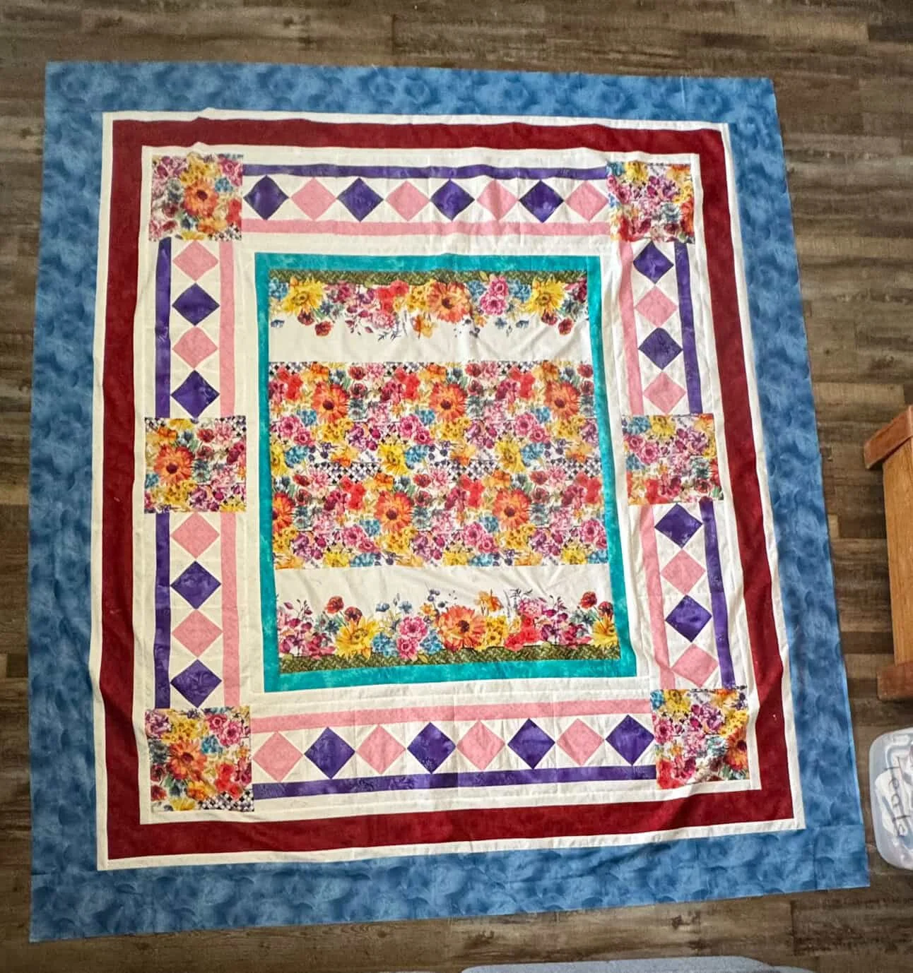 Cheri Bono has created an amazing version of this pattern. She needed to be creative and build on the center panel to get the size she needed for the pieced outer border. Lovely work, Cheri! Thank you!